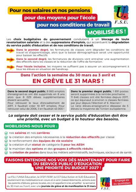 Pour dénoncer et refuser les suppressions d’emplois de la rentrée 2026 et leurs conséquences, exiger un budget 2027 avec des mesures de créations d’emplois, exiger une revalorisation salariale sans contrepartie, la FSU, l’UNSA Éducation, la CFDT Éducation Formation et Recherche Publiques, la CGT Educ’Action et SUD Éducation appellent à une journée de grève le mardi 31 mars.
